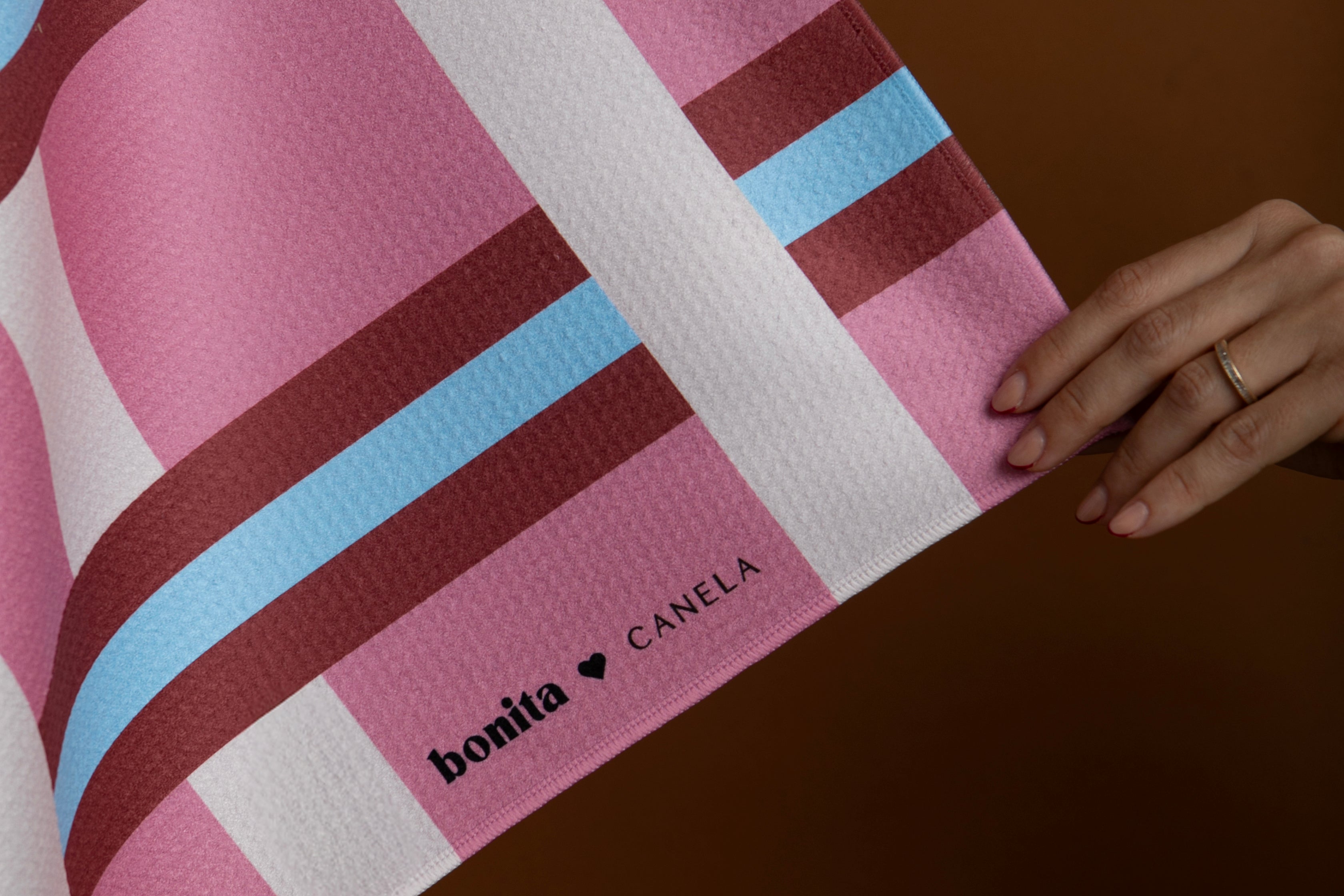 Bonita y Canela se unen para crear una toalla de playa y piscina diseñada en conjunto, donde el color, el diseño y el estilo se encuentran.